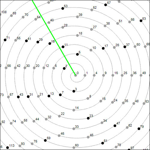 I have a special reason for including angle 1/4 on this page. When I first wrote this website in 2003, I didn't realize that every rational angle has composite curves. Therefore I was puzzled by the prominent columns of non-prime numbers that march north and south from the center of the spiral, and I published the following picture as a mystery to be solved later: