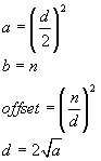 To convert between a composite offset curve of angle n/d (measured in rotations) and its related quadratic function ax2 + bx: